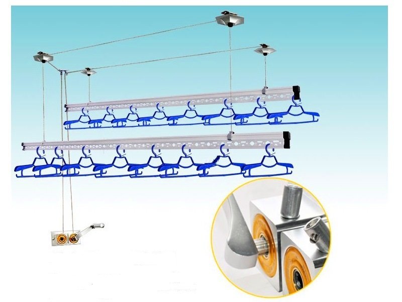+ Puly và dẫn hướng chịu lực cao giúp dây cáp và thanh phơi thăng bằng khi phơi. Nên phơi cân bằng quần áo dàn đều trên thanh phơi tránh tình trạng tại trọng dồn về một phía. Luôn luôn quay đúng chiều tránh bị rối dây cáp