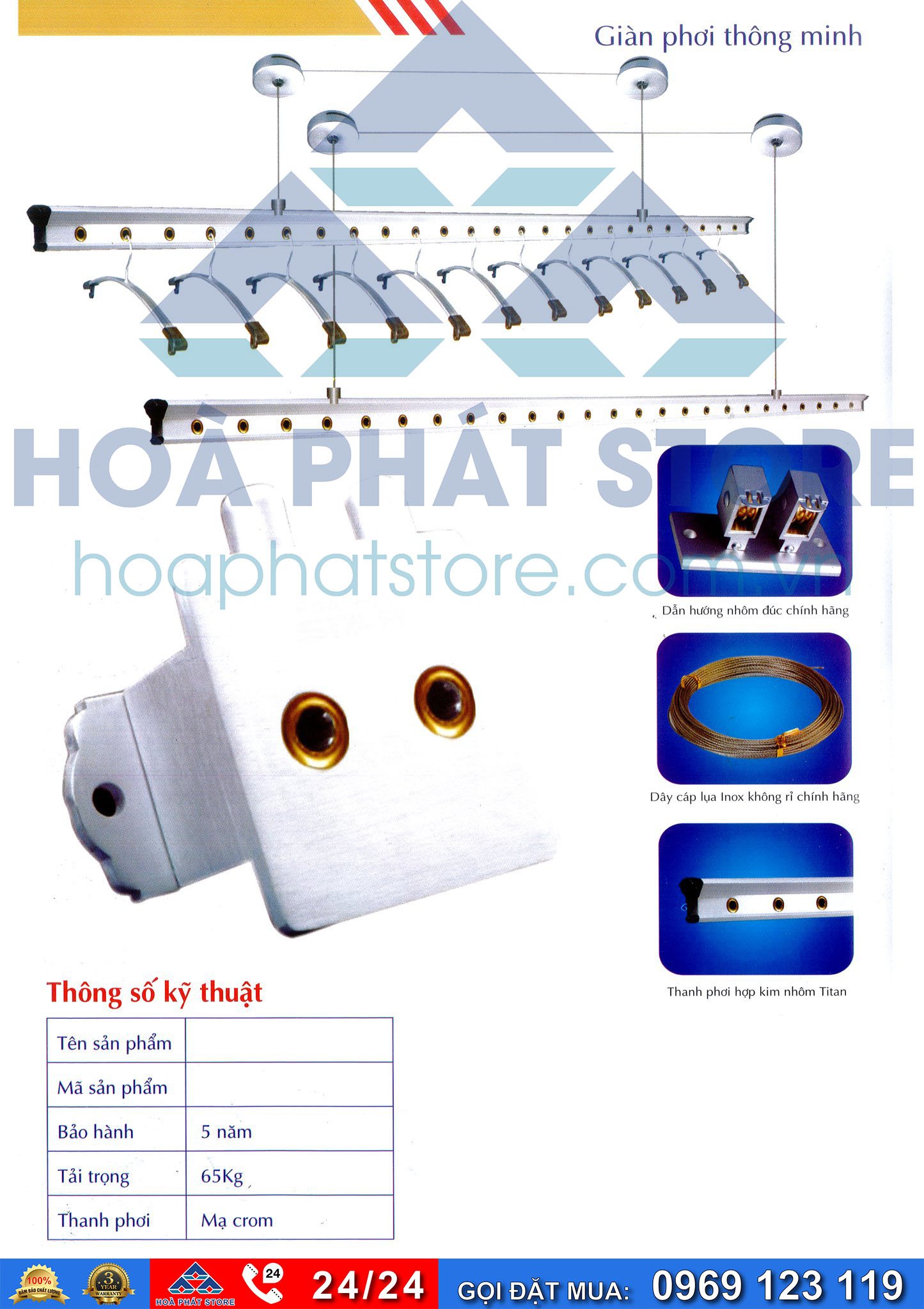 Thanh phơi: Nhôm hợp kim màu trắng,2 thanh phơi mỗi thanh dài 2,4m,có 58 lỗ treo